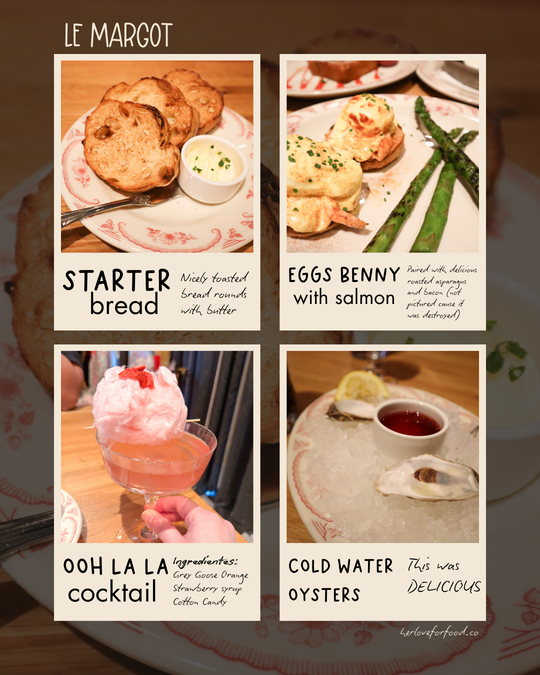 I started with the Cold Water Oysters which were AMAZING along with the Potato Leek Bisque (which was amazing with the starter bread). I then got the Margot Eggs Benedict with Salmon which tasted anything but smoked. It was fluffy and flaky. With a side of Asparagus and Bacon which was so good I ordered another to go. I also got the Ooh La La Cocktail which was… strong.